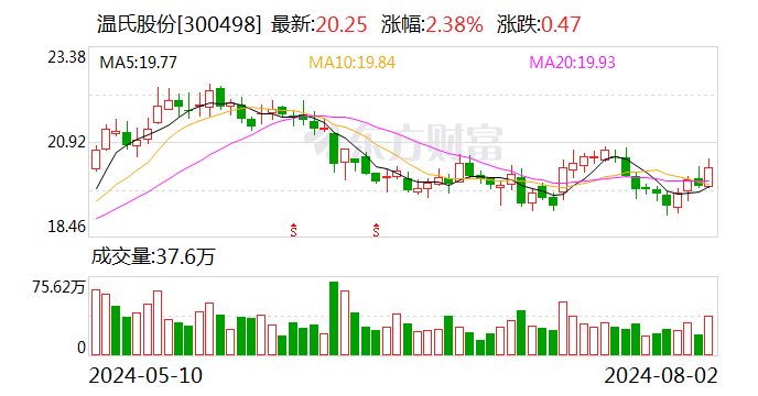 证券时报·数据宝统计显示,温氏股份今日收盘价为20.25元,上涨2.38%,日换手率为0.69%,成交额为7.61亿元,全天主力资金净流入126.47万元,近5日该股累计上涨3.42%,近5日资金合计净流出5814.97万元。